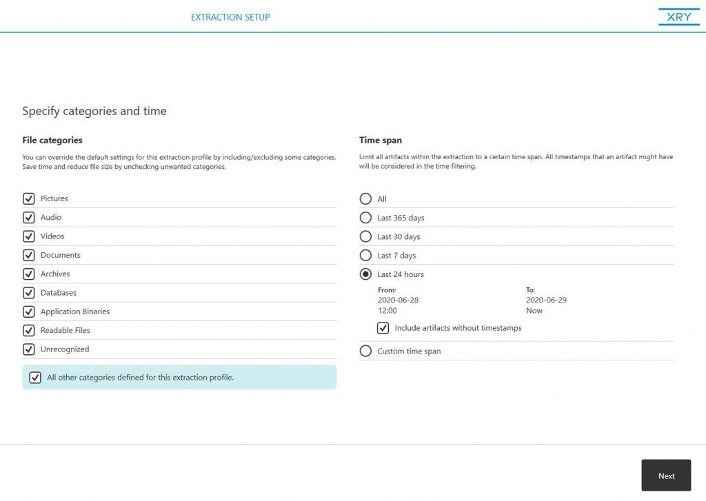 XRY 9.1 presenta una versión actualizada de la función paso a paso “Categorías e intervalos de tiempo” que permite a los examinadores, al personal de primera línea y otros, matizar rápidamente sus extracciones a categorías de archivos individuales dentro de intervalos de tiempo específicos. Esto permite a los operadores restringir las investigaciones de dispositivos móviles para satisfacer los requisitos legales, como restricciones de tiempo en la recuperación de datos.